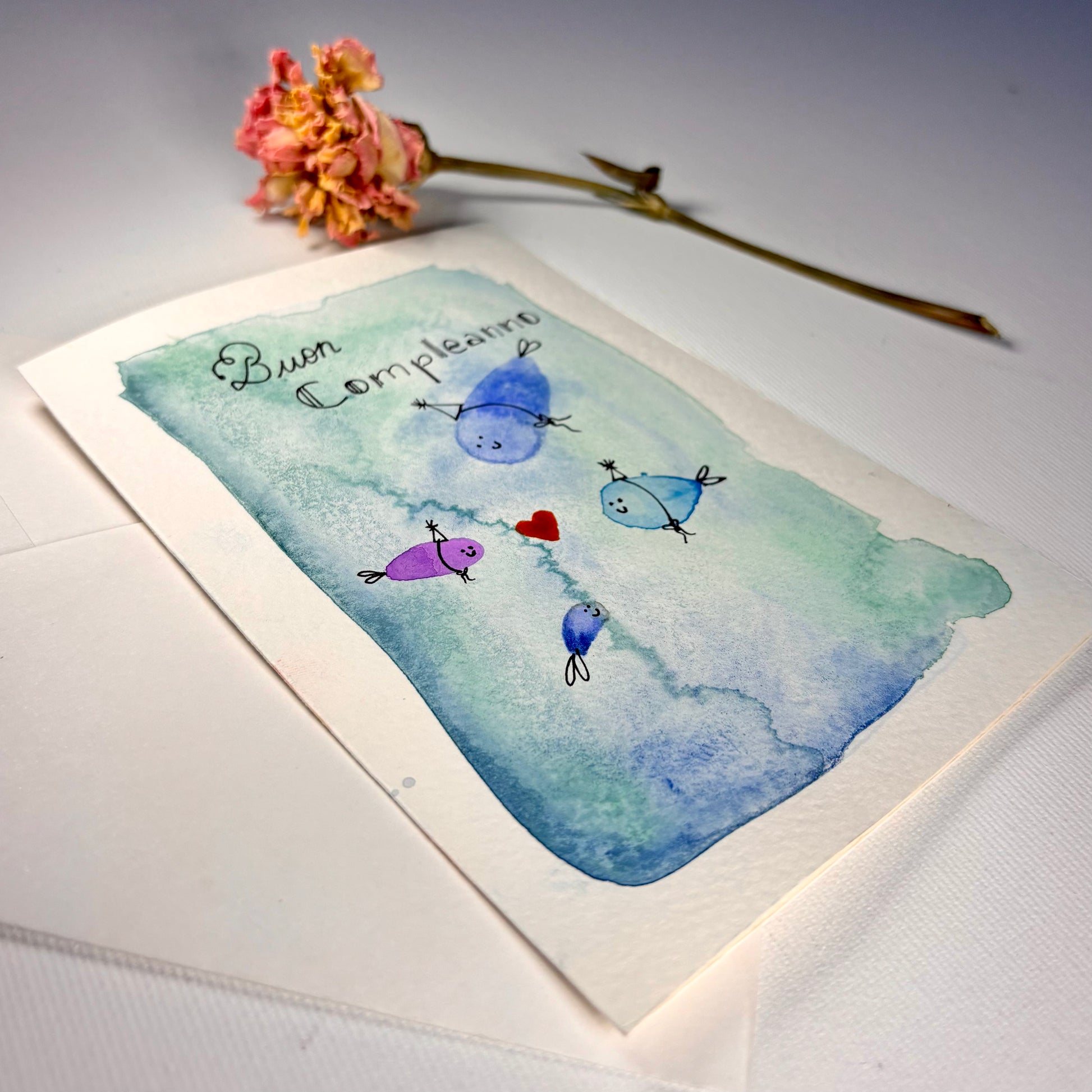 Diese handgemachte Aquarellkarte ist mit Liebe und Sorgfalt von Hand gemalt – kein Druck, sondern ein echtes Einzelstück. Jede Karte erzählt ihre eigene kleine Geschichte und bringt Farbe, Gefühl und Persönlichkeit in deinen Gruß.